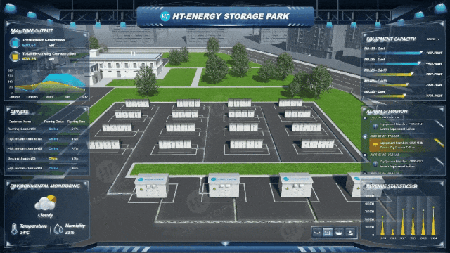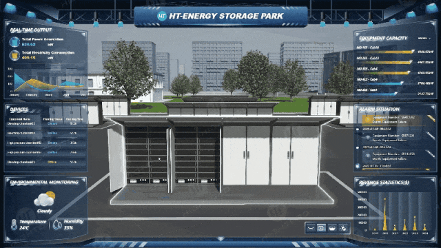 HT 强大的 3D 渲染引擎对储能柜、升压仓、汇流柜等园区核心设备展开 1:1 高精度数字化构建,场景内能清晰查看设备的材质、结构等外观特征。支持对电气参数进行多层级可视化呈现,方便运维人员深入了解设备内部运行状态。
