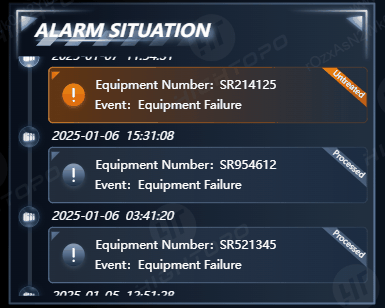 HT 平台内实时汇集设备故障等异常事件信息,清晰展示发生警报的设备编号以及事件类型。运维人员可依据不同的标识(如已处理和未处理的区分),快速辨别警报处理状态,定位问题设备,明确故障状况。
