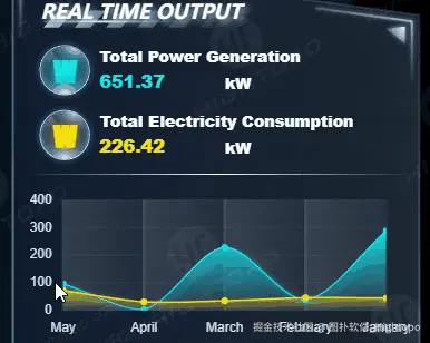 图扑 HT 凭借自研 WebGL 数据可视化技术,深度集成总发电能力、总用电量历史数据,生成时间维度的趋势图表,让能源产出与消耗的变化轨迹一目了然。