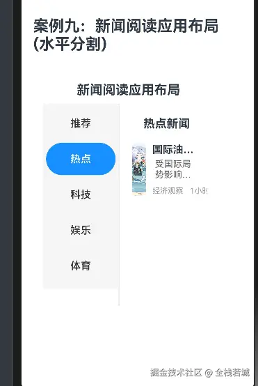 左侧新闻分类区域与基础篇相同,使用Column组件包含一系列分类按钮: