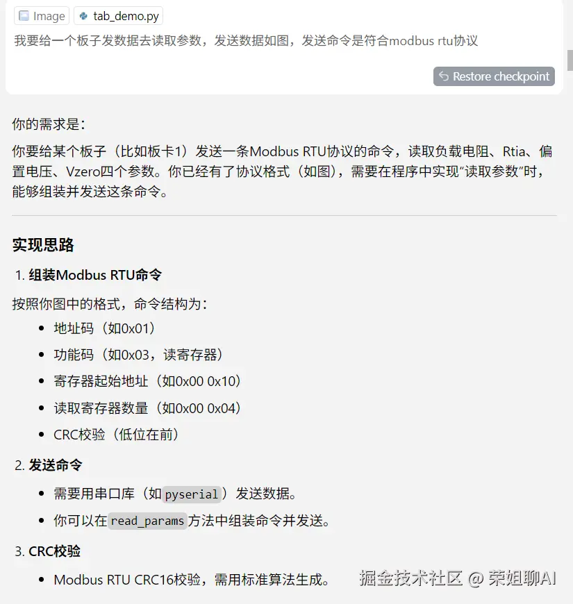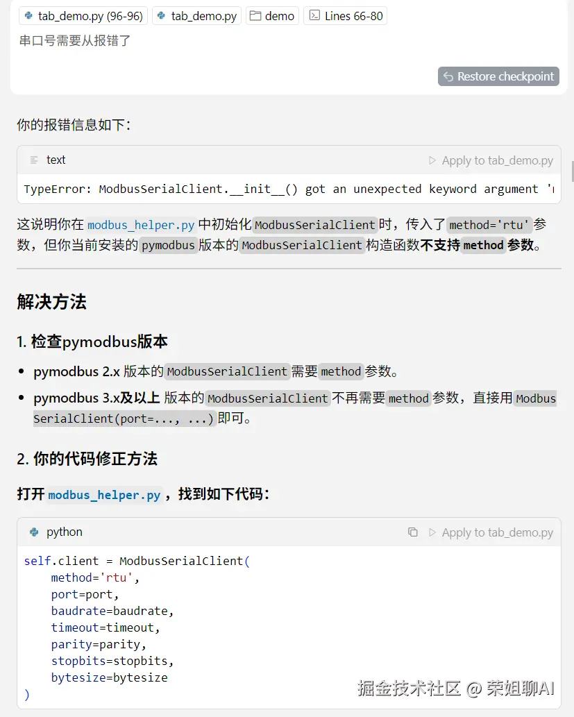 运行调试,第一次给出的modbus库是python2的用法,报错后直接给到Cursor就行了。