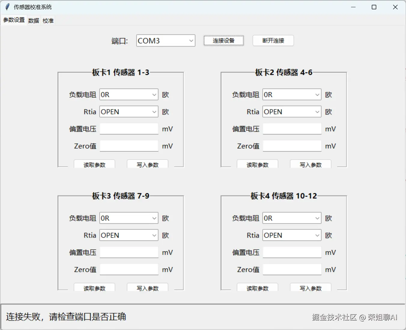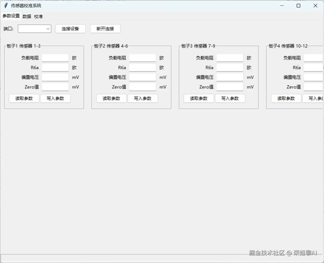 我现在的程序是一个纯demo,现在把参数设置选项卡的界面设置如图所示。主体是部分,第一块是选择端口的一个下拉框,连接设备按钮,断开连接按钮。第二部分是四个班子,每个班子可以设置负载电阻、Rtia、偏置电压、Zero值,还有读取参数和写入参数两个按钮。四个板子界面布局一样。第三部分是状态栏,我的异常数据或发送数据在状态栏显示。