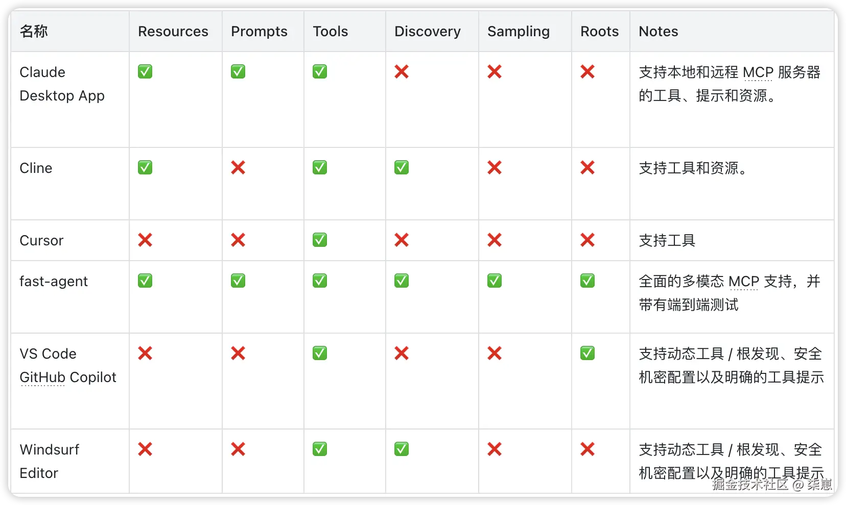 完整的客户端支持情况见:modelcontextprotocol.io/clients