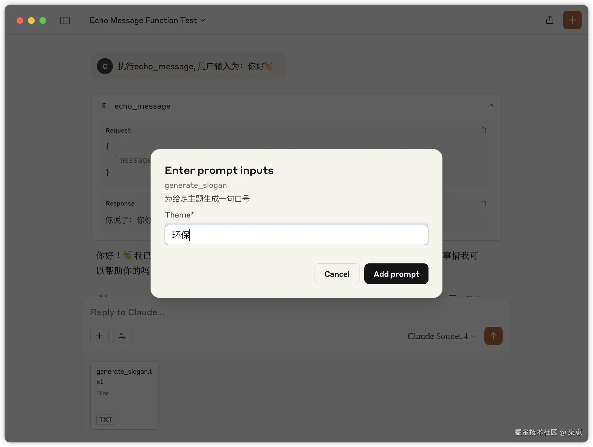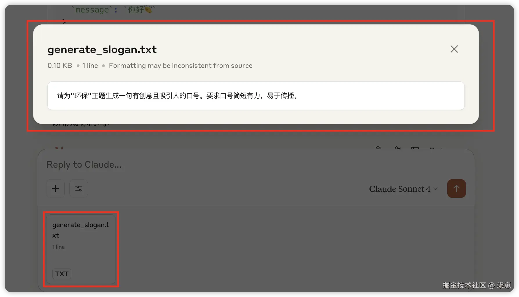 可以看到对话框底部有个TXT的文件,打开之后,可以看到这是我们的MCP服务返回的提示词。
