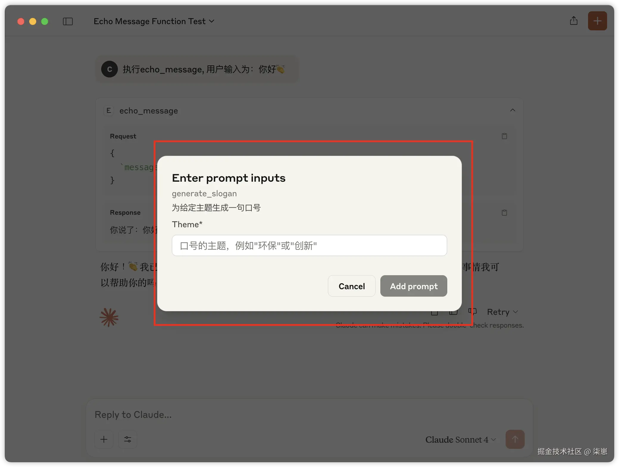 我们选择generate_slogan功能,这个我们开发的提示词功能。