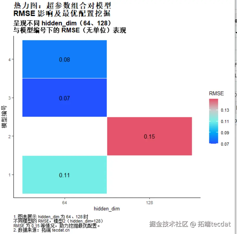柱状图展示了每个模型配置下的RMSE和R²值,能够直观比较不同超参数组合的模型性能。横坐标表示不同的模型配置,纵坐标分别表示RMSE和R²,通过这些对比,我们可以评估每种超参数配置在实际任务中的效果。