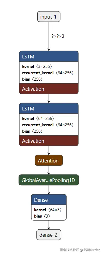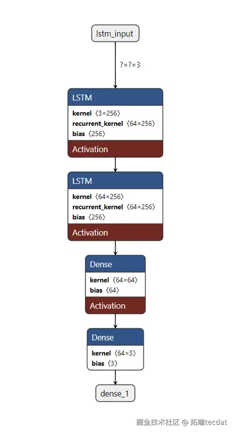 采用两层LSTM网络提取时序特征,第一层返回所有时间步的隐藏状态以保留序列信息,第二层仅输出最终时间步特征用于预测。全连接层通过ReLU激活函数实现非线性映射,输出层维度与输入特征一致(三维:时间、经度、纬度)。模型代码如下: