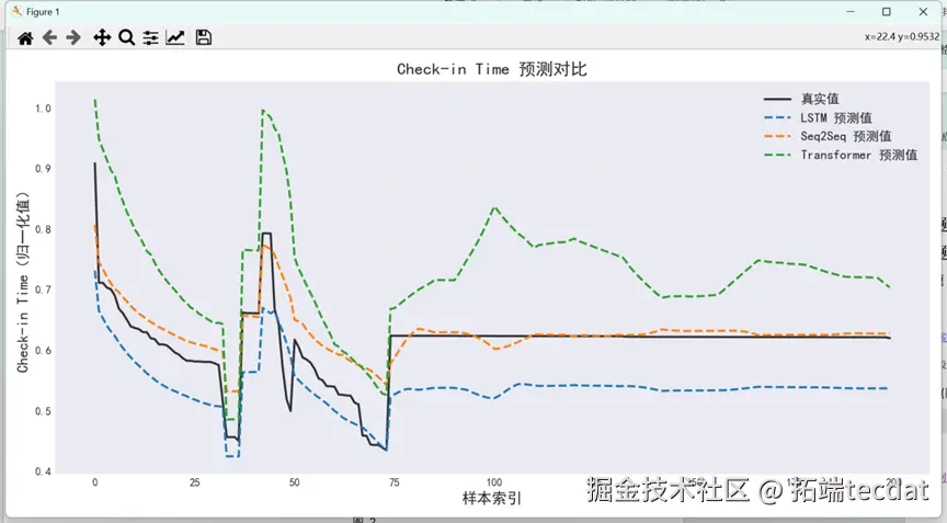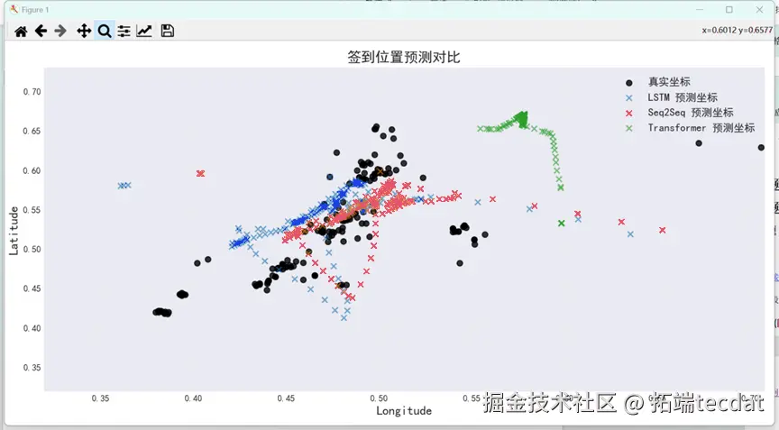 通过均方根误差(RMSE)和决定系数(R²)评估模型表现:Seq2Seq模型的RMSE最低(0.086),R²达0.354,显著优于LSTM(RMSE=0.104,R²=0.228)和Transformer(RMSE=0.113,R²=-0.208)。可视化结果显示,Seq2Seq的时间预测曲线与真实值高度吻合(图5),空间预测点分布更贴近实际轨迹(图6)。