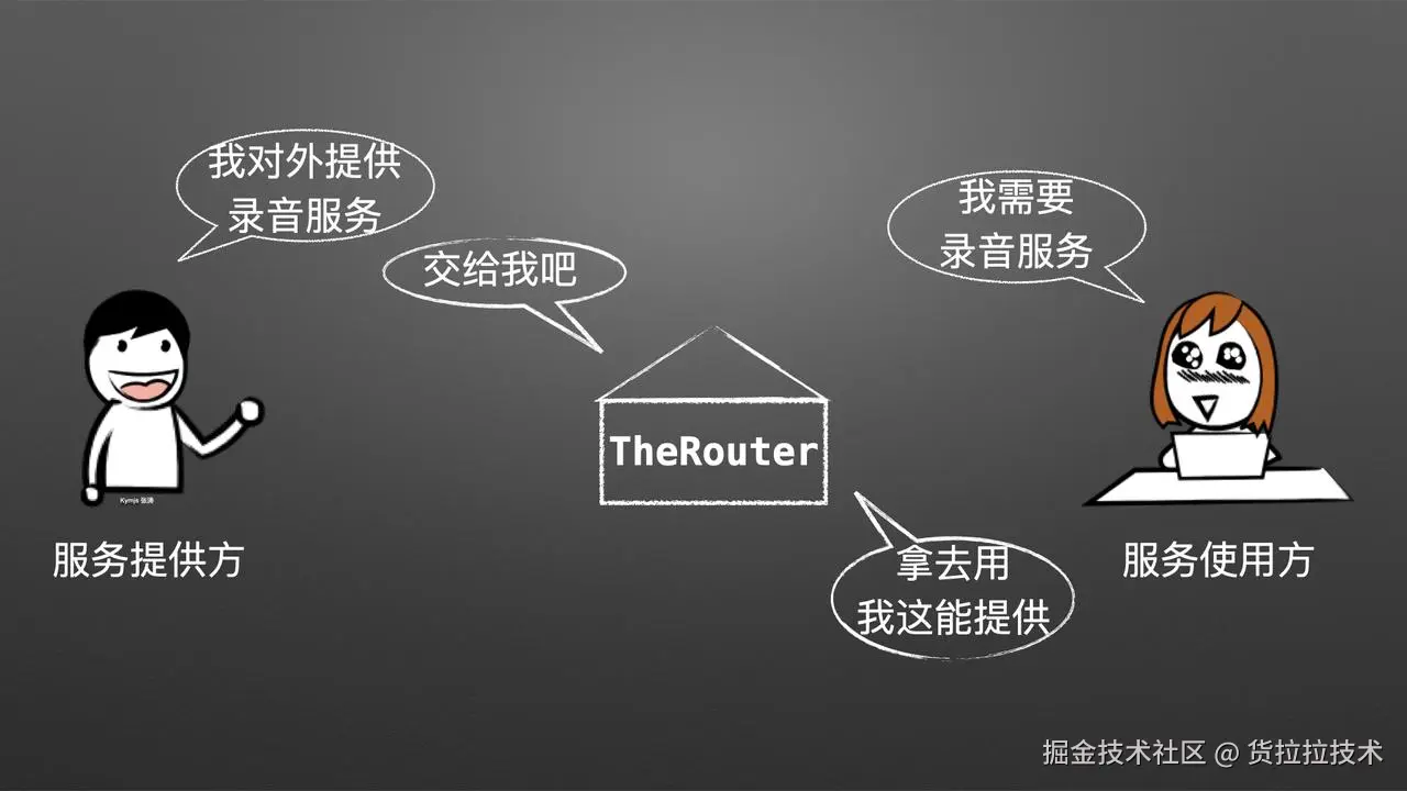 例如上面的图片:拉拉需要使用录音的服务,小货则向外提供一个录音的服务,由TheRouter的ServiceProvider负责撮合。