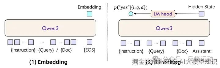 - Embeding模型:以单个文本片段作为输入,通过利用与最终[结束符]([EOS])标记对应的隐藏状态向量来提取语义表示。