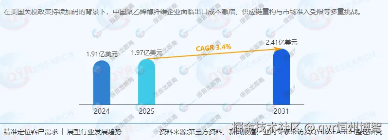 聚乙烯醇纤维(PVA Fiber)是一种以聚乙烯醇(PVA)为原料合成的高性能纤维,具有高强度、高模量、耐化学腐蚀及生物降解性,广泛应用于运输、建筑、水利、纺织及农业等领域。根据QYResearch数据,2024年全球聚乙烯醇纤维市场销售额为1.91亿美元,预计2031年将增长至2.41亿美元,2025-2031年复合年增长率(CAGR)为3.4%。尽管增速相对平稳,但行业正经历结构性调整:美国关税政策倒逼中国企业加速全球化布局,技术升级与市场多元化成为核心战略。