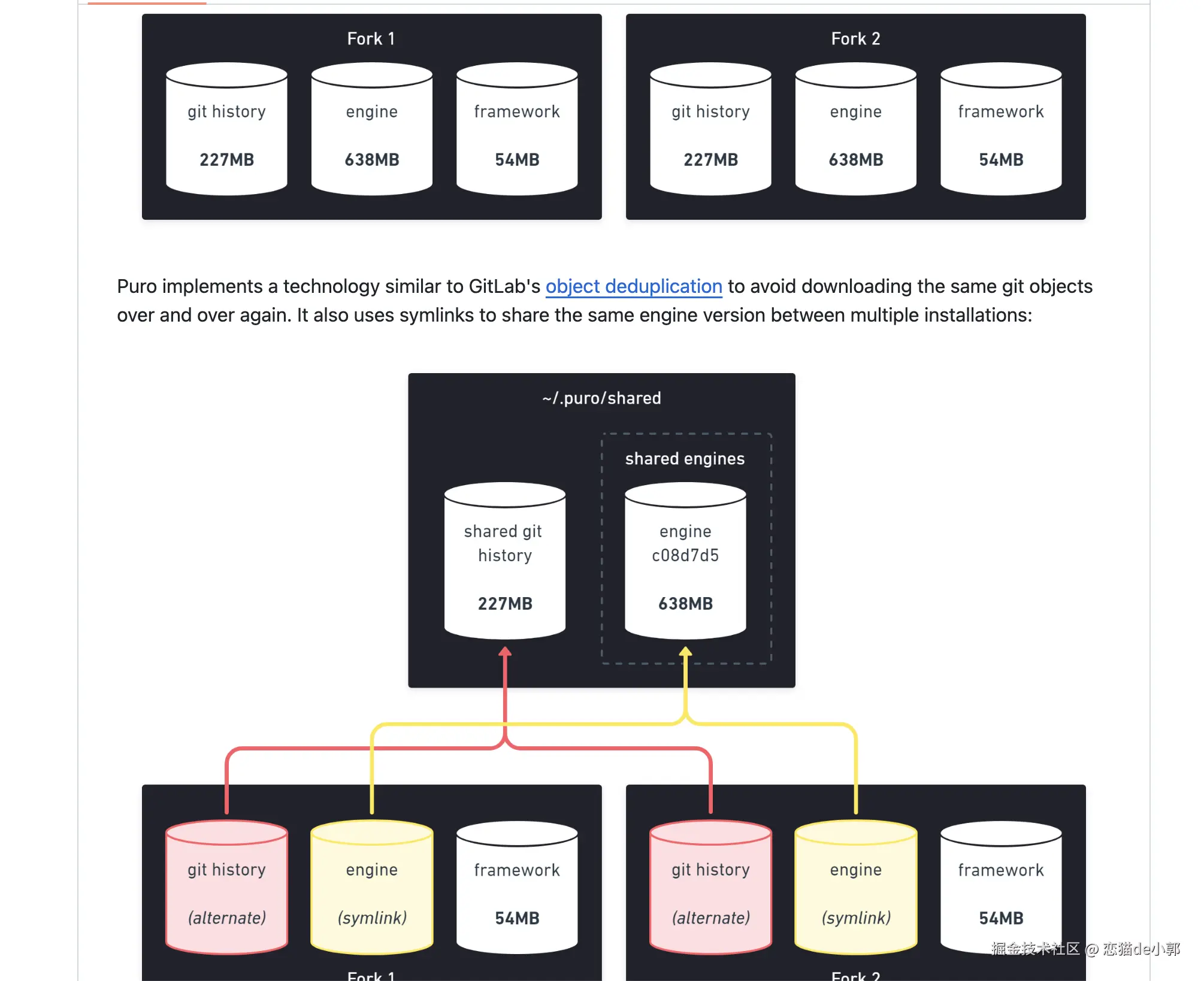 - 全局 Git 历史缓存与对象去重 :Puro 实现了一种与 GitLab 的对象去重(object deduplication)技术相类似的方法,当安装或切换不同 Flutter 版本时,Puro 不会为每个版本都下载和存储完整的 Git 历史记录,而是维护一个全局的 Git 对象缓存,如果不同 Flutter 版本之间共享相同的 Git 对象,这些对象在全局缓存中只存储一份