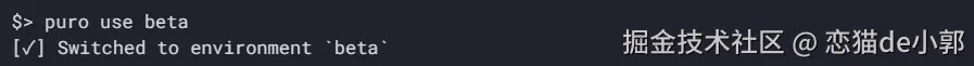 如果你不想全局切换,那么不是用 -g ,就只切换当前项目的环境,这个命令会创建一个 .puro.json,这个文件告诉 Puro 要使用哪个环境,并且会自动被 git ignored: