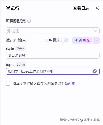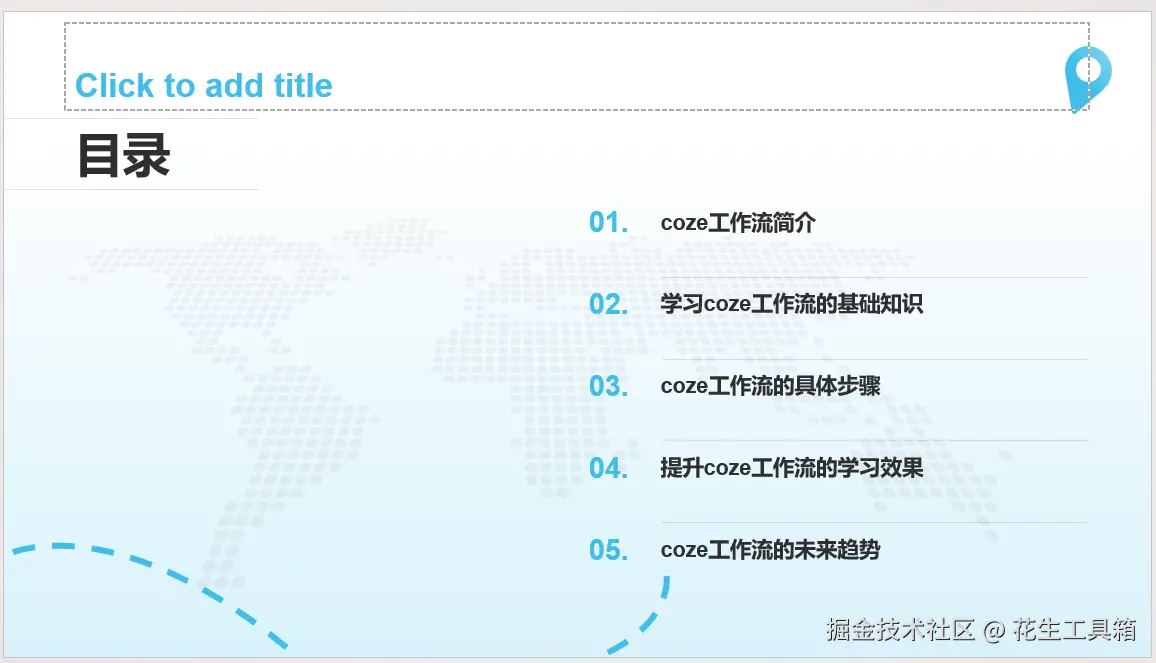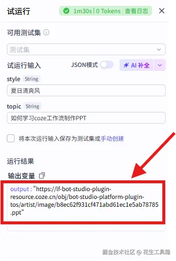 利用这种方式,无需手动操作,就能借助AI实现快速的演示文稿制作。我们的系列教程已在公众号“花生工具箱”免费开放,欢迎关注并加入扣子交流群,一起学习更多工作流案例,开启智能办公新体验。 👉 评论区告诉我你最想学哪个工作流?一起分享~