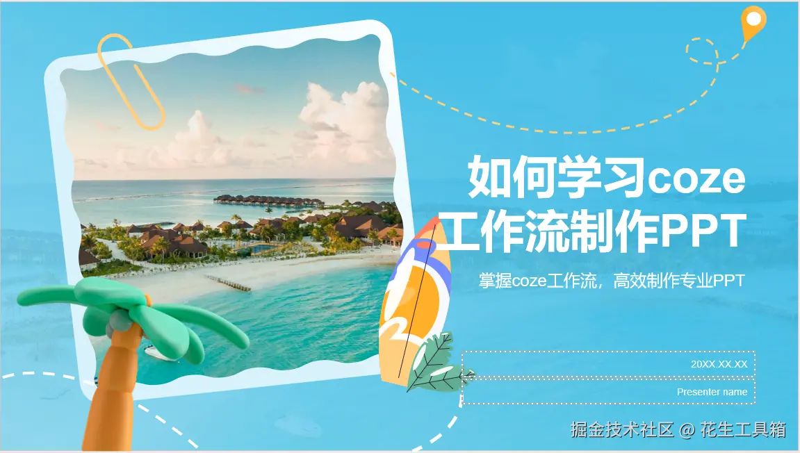 大家好,我是花生,专注于AI技术的探索与实践。今天为大家带来一个高效且实用的解决方案——借助扣子(Coze)平台搭建智能工作流,实现PPT的自动化生成,从此告别逐页手动制作,告别繁琐操作,大幅提升工作效率。