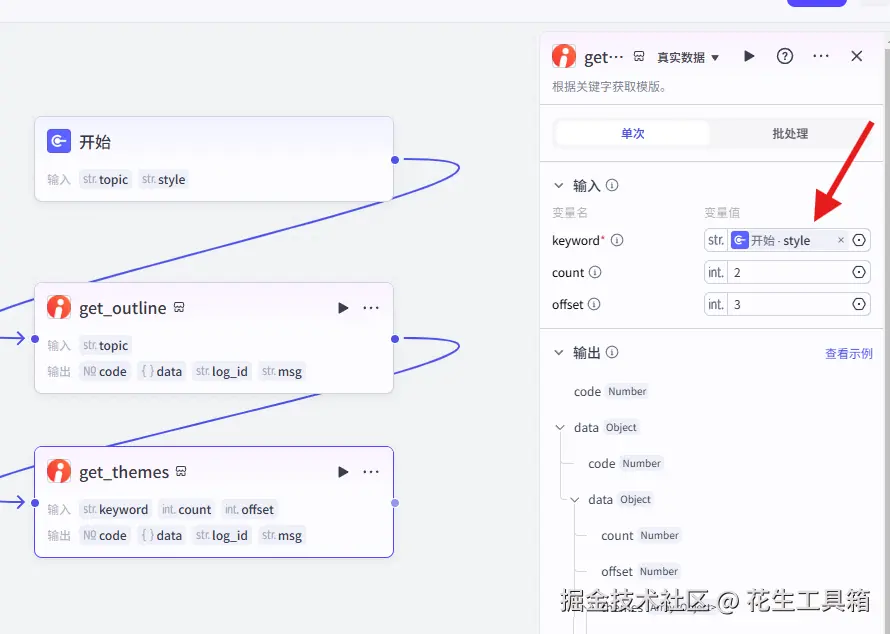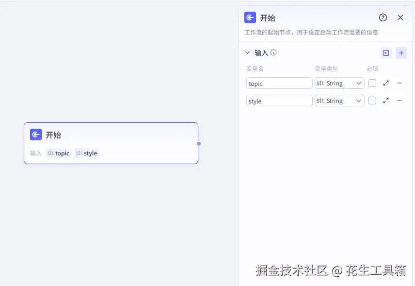 - 在开始节点里,设置两个变量topic和style,用于存储PPT的主题和模板类型