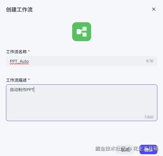 - 首先,登录扣子平台,在主界面找到 “新建工作流” 按钮,点击进入创建页面。这里就像一个空白画布,等待我们绘制出 PPT 自动生成的 “蓝图”。按照系统提示,为新建的工作流命名,建议名称与 PPT 制作功能相关,方便后续查找和管理,例如 “PPT_Auto”。