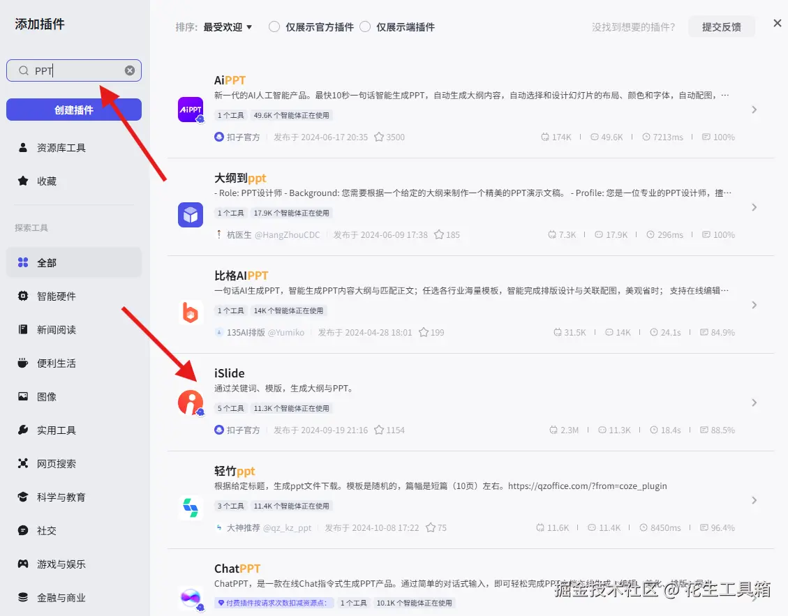 在扣子的插件商店搜索“PPT”,选择官方插件,建议启用“仅显示官方插件”以确保稳定性。本文以“Slide”插件为例,它提供了多项实用工具,便于串联成完整的PPT制作流程。