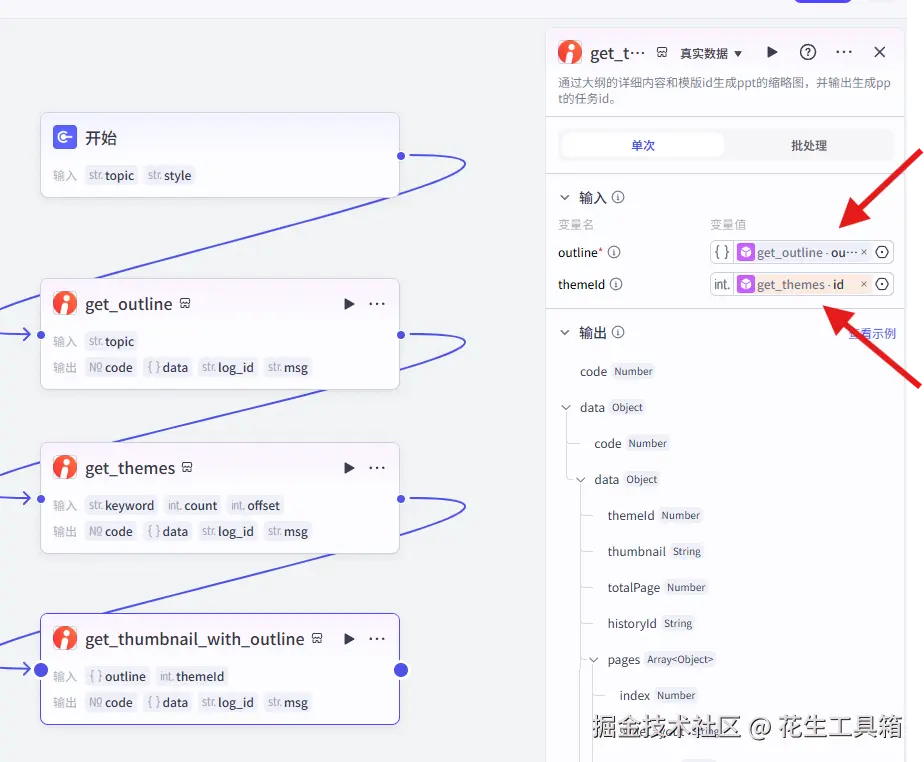 - 添加“get_thumbnail_with_outline”工具节点(实际用于发起任务并返回任务ID)
