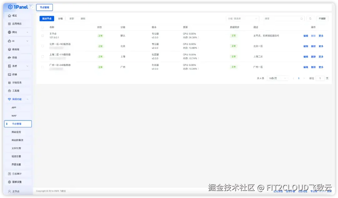 1Panel V2版本启用“主从式”多机管理架构,用户通过一台主机,即可集中连接和管控多台从机服务器,从而实现资源监控、应用部署、命令下发等核心运维操作。新版1Panel还支持节点状态的实时同步与分组管理,能够轻松应对多服务器环境下的复杂场景,真正实现“单一面板统一运维、多主机高效协同”的目标,大幅提升企业运维管理的效率和便捷性。