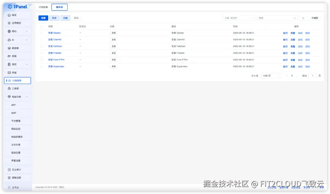 为了解决手动安装常用工具的问题,1Panel V2版本支持集中管理工具箱中的各类应用安装脚本。用户不仅可以基于内置脚本一键克隆并自定义调整,也可以上传自定义脚本至脚本库,在创建Shell类型计划任务时直接调用,实现脚本的统一维护、灵活调度与高效复用,快速构建智能、高效的自动化运维体系。