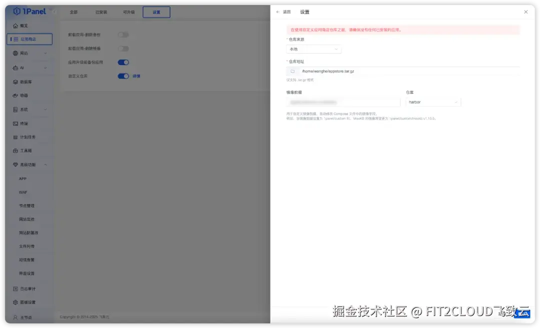 1Panel V2版本全新支持应用和镜像仓库的自定义配置,支持接入私有仓库和自建镜像源。