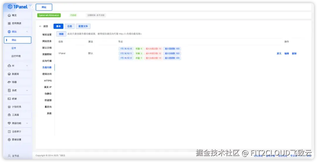 1Panel V2版本内置网站负载均衡功能,支持可视化配置,操作简便高效。借助这一功能,用户可以灵活设置多节点流量分发、主备节点切换、健康检查等策略,显著提升网站在高并发场景下的稳定性与抗压能力。无论是单站扩容,还是多站协同部署,均可一键实现,有效保障用户访问体验。