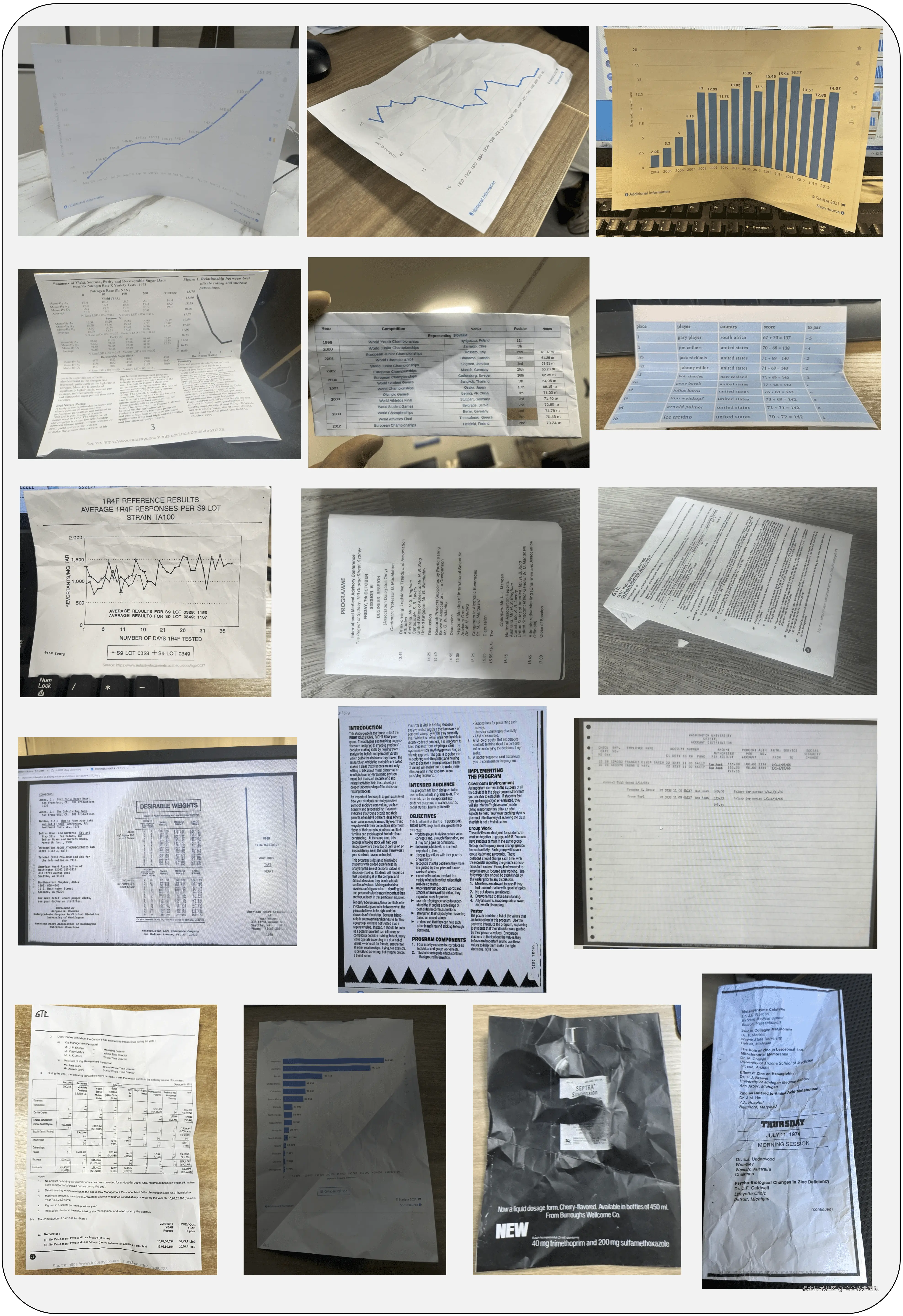 以 TextIn xParse 为例,我们选取了 WildDoc 数据集中的部分有代表性的样本进行测试,来看一下识别结果: