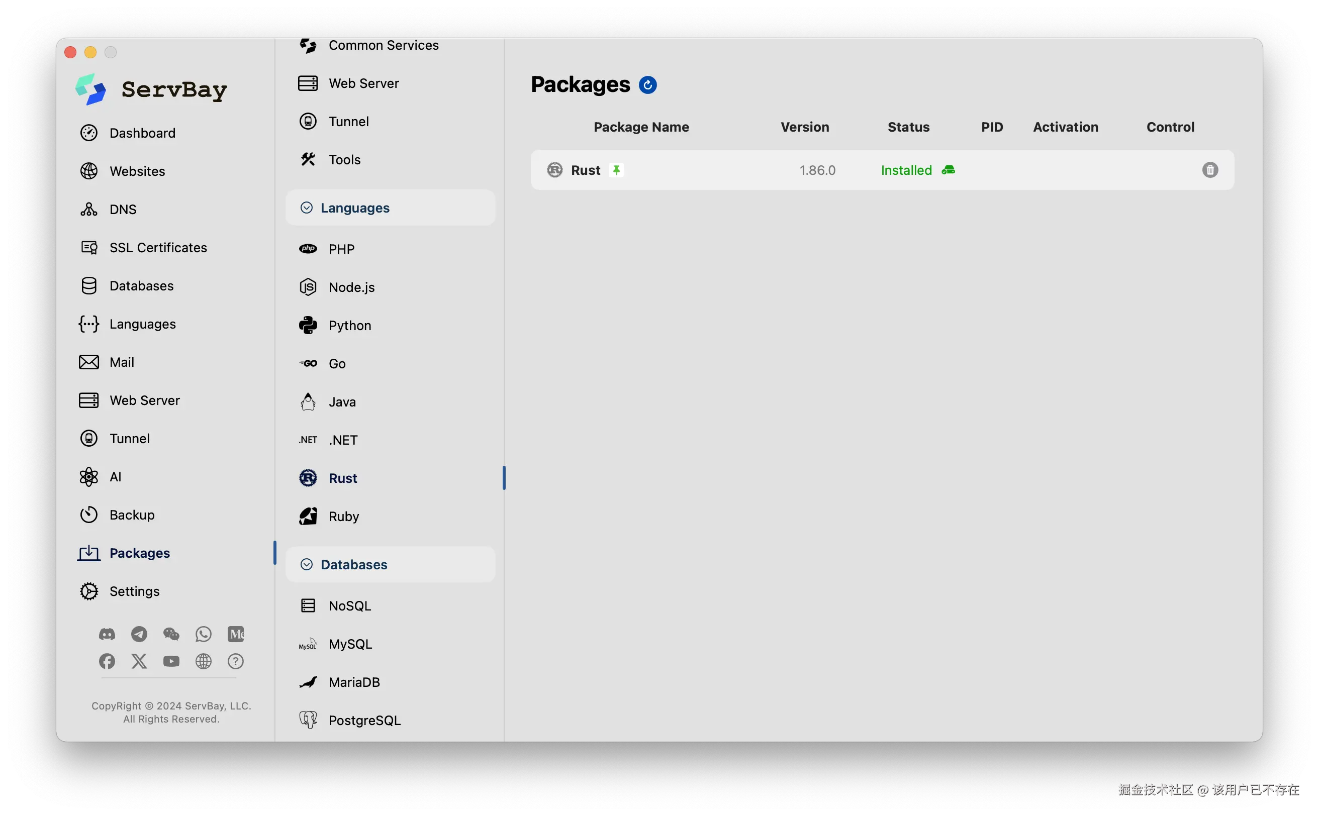 一键拥有 Rust 环境: 我想尝试用 Rust 写个小项目,在 ServBay 里,我只需要在服务列表里点一下开关,一个完整的 Rust 开发环境就绪了。
