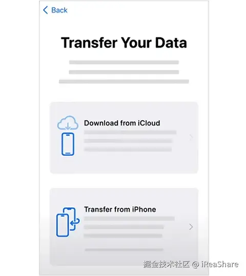 第 4 步: 在这里,您可以选择传输数据:“从 iCloud 下载”或“从 iPhone 传输”。选择一个选项并继续完成传输。然后您的电话号码和其他数据将被转移到您的新 iPhone。