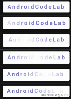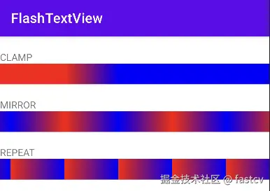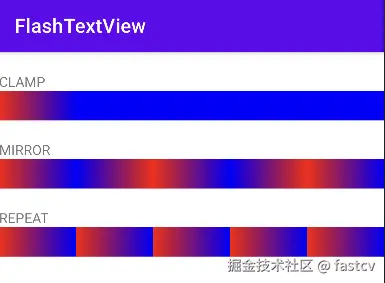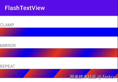 首先给TextView的画笔设置了一个 [Color.BLUE, 0xffffff, Color.BLUE] 两端蓝色、中间白色的 LinearGradient,用中间的白色达到闪烁的效果。并且设置的TileMode是CLAMP,了解过上面知识点的就知道,它会两端的颜色延伸,所以保证除了中间的白色闪光效果,其他的文字颜色一致。