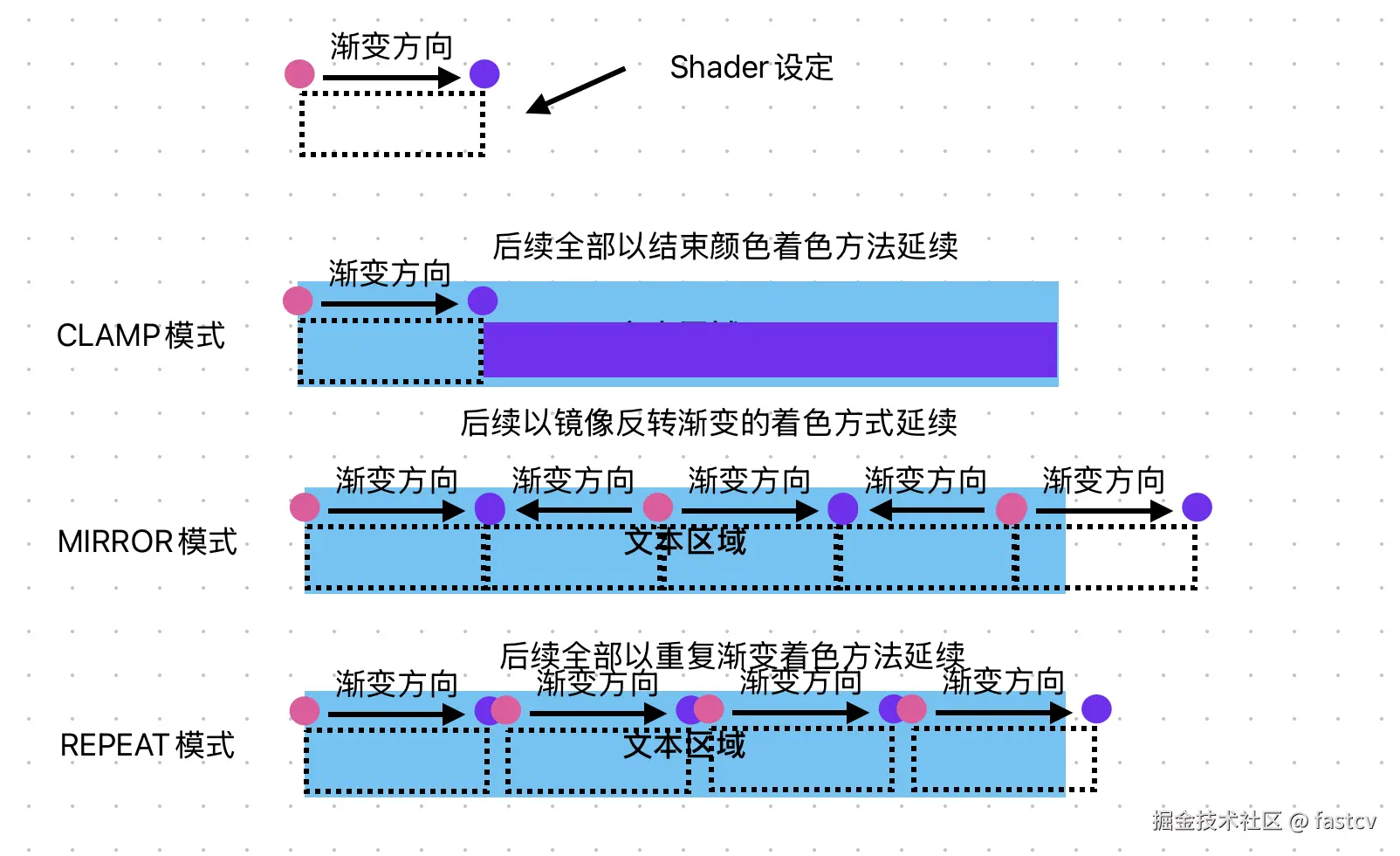 - tile:端点范围之外的着色规则,类型是 TileMode。TileMode 一共有 3 个值可选:CLAMP, MIRROR 和 REPEAT。