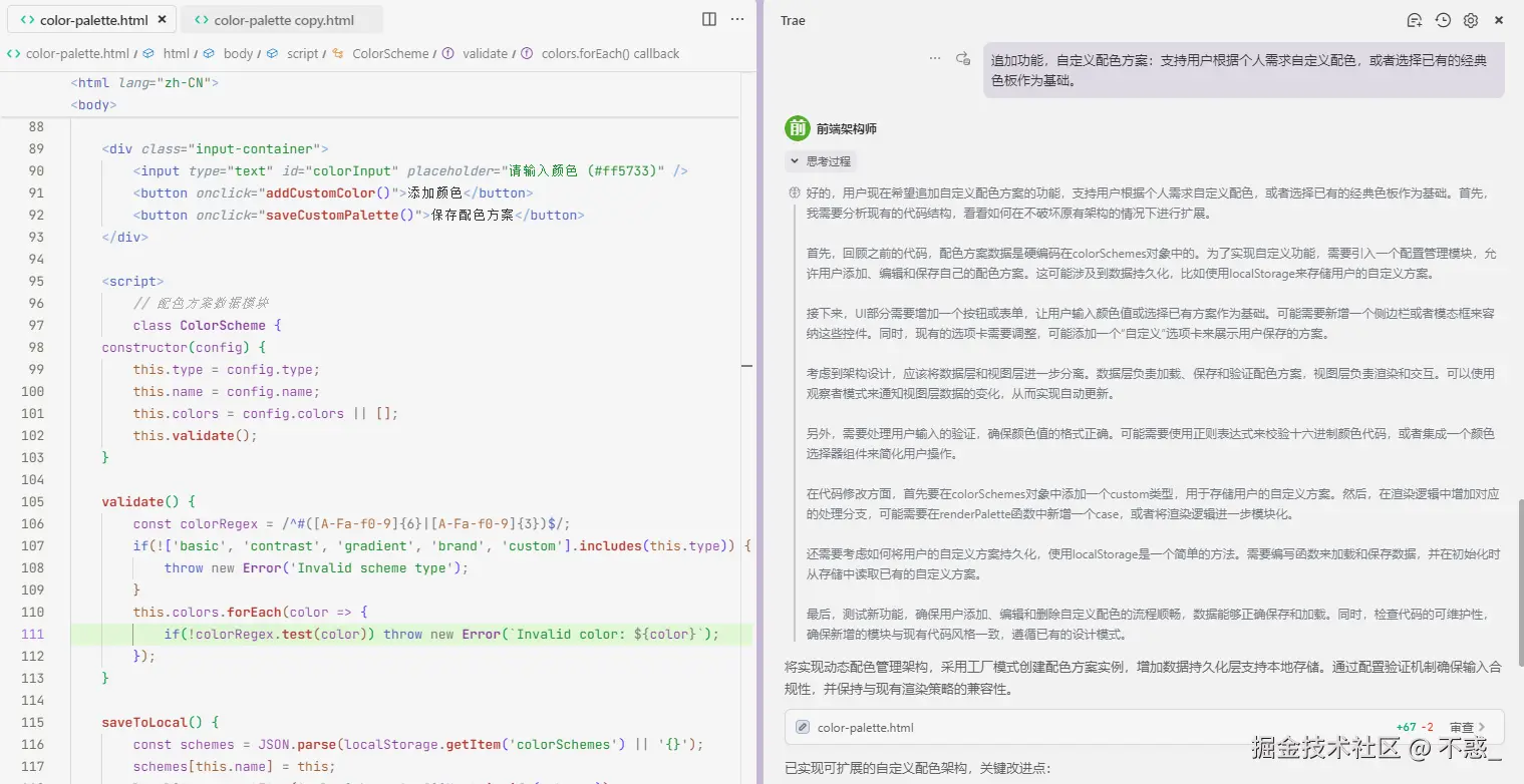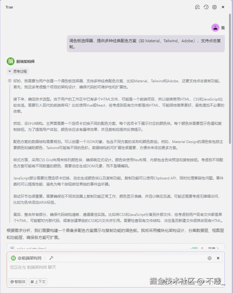 结合 Trae 的智能交互,用户可以通过简单的指令获取理想的配色方案,进一步提高工作效率。如果你是设计师,或者正在从事前端开发,这个调色板选择器绝对是你必备的工具之一。