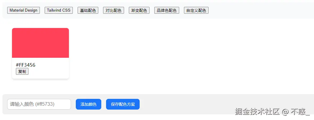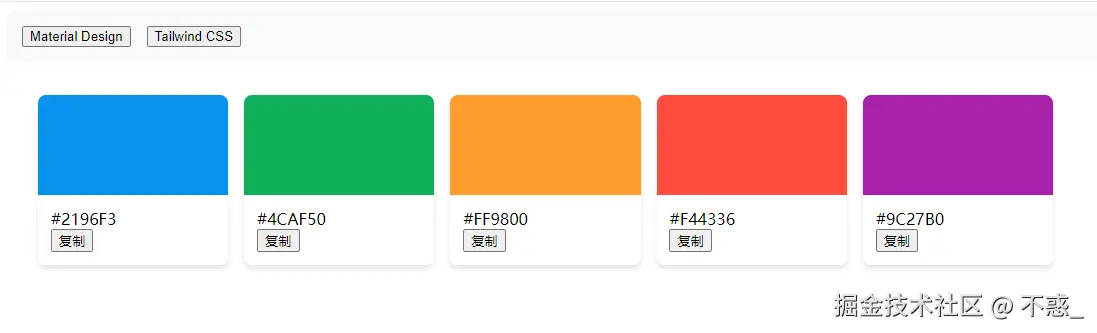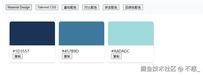 调色板选择器,提供多种经典配色方案(如 Material、Tailwind、Adobe),支持点击复制。