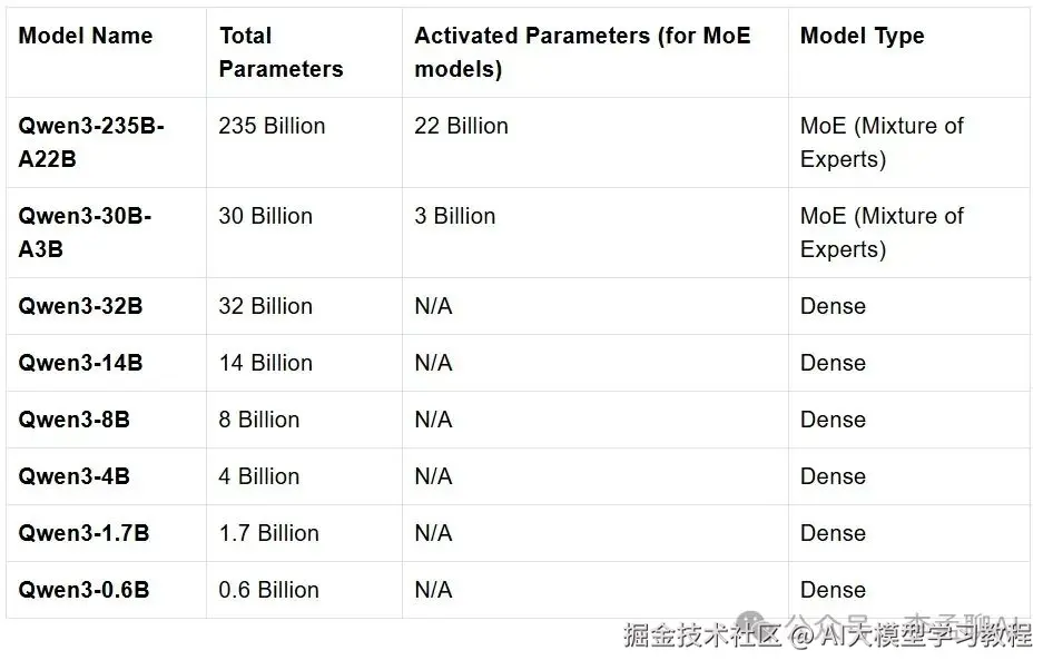 Qwen3系列包含8个模型,其中两个是混合专家(Mixture-of-Expert, MoE)模型,而其他6个是密集模型。下表包含了所有这些模型的详细信息: