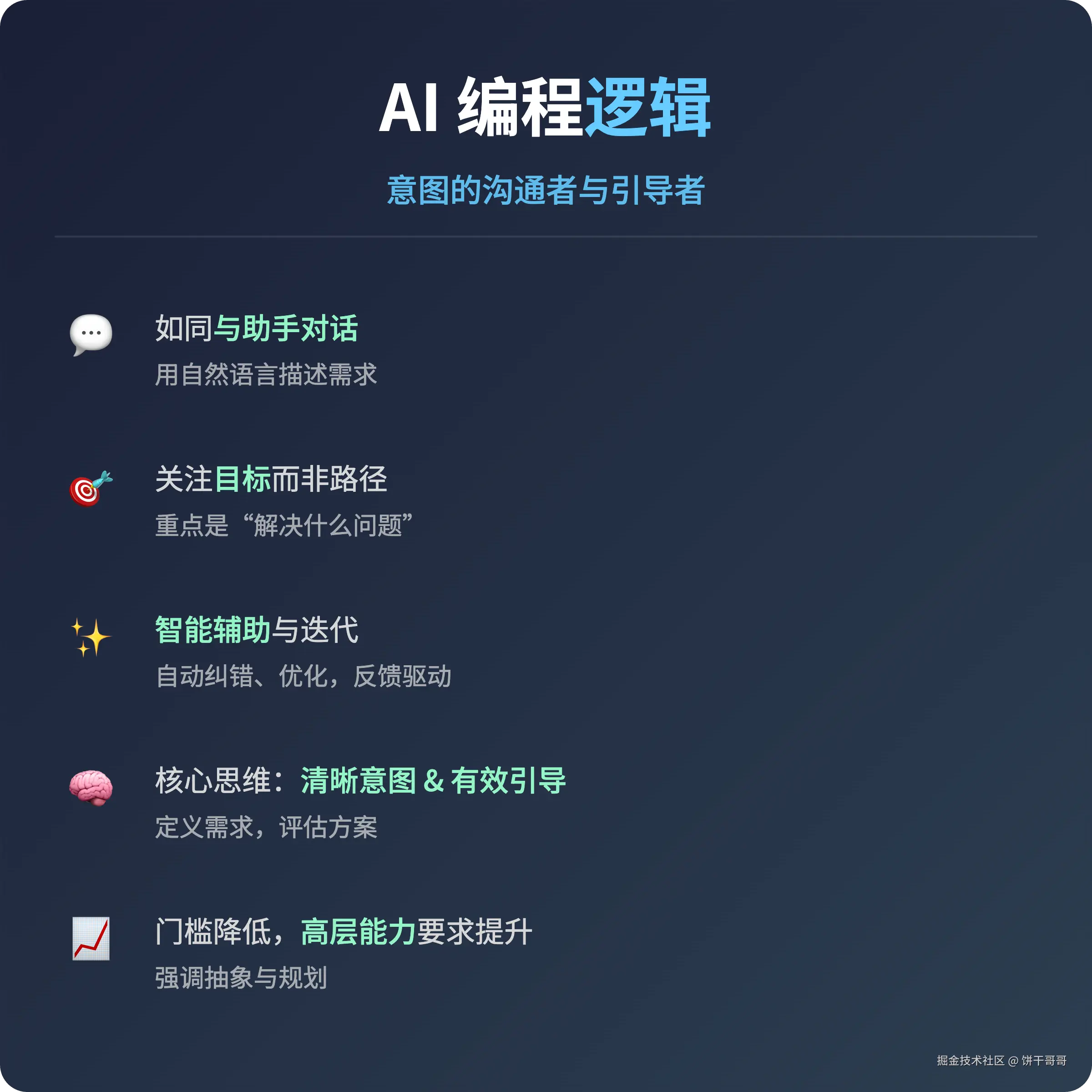 - 核心思维: 重点在于 “清晰地表达意图”并“有效地引导AI” 。开发者需要具备更强的需求定义、方案评估和结果验证能力。这并非意味着编程基础不重要,而是入门门槛降低,对高层抽象和逻辑规划能力的要求提升。