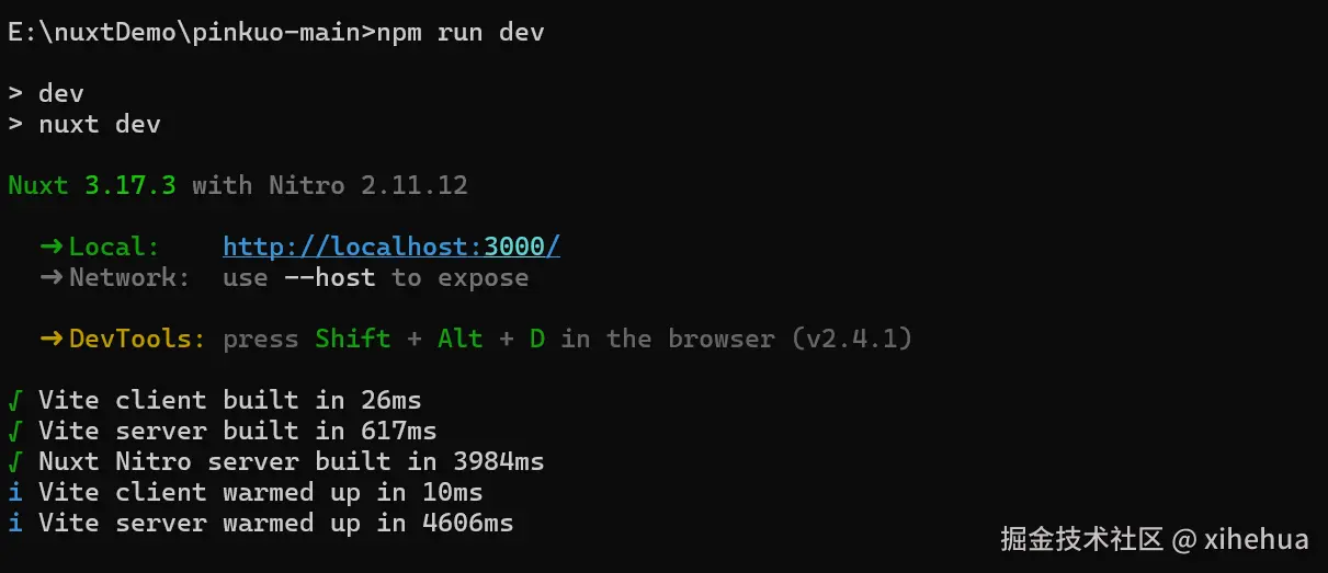 然后再输入 npm run dev 等待一下 就会看到项目运行编译好了 就会出现下面内容