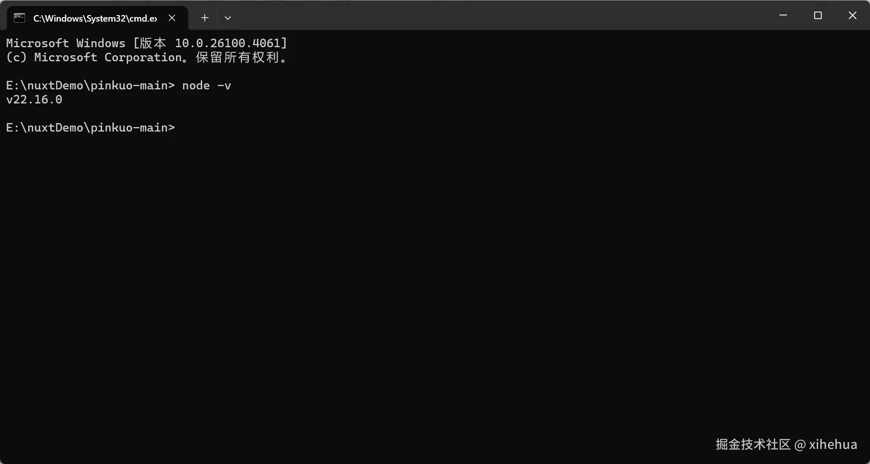 然后我们试试 刚刚安装的 node.js 是否安装成功 输入 node -v 一般来说点 一直点下一步 不会有什么问题的 ,输入后会看到 node.js 版本号(你的版本号可能与我给的图片不一样,没关系的因为我是前面就安装过了)看到版本号就说明 安装node.js 成功了
