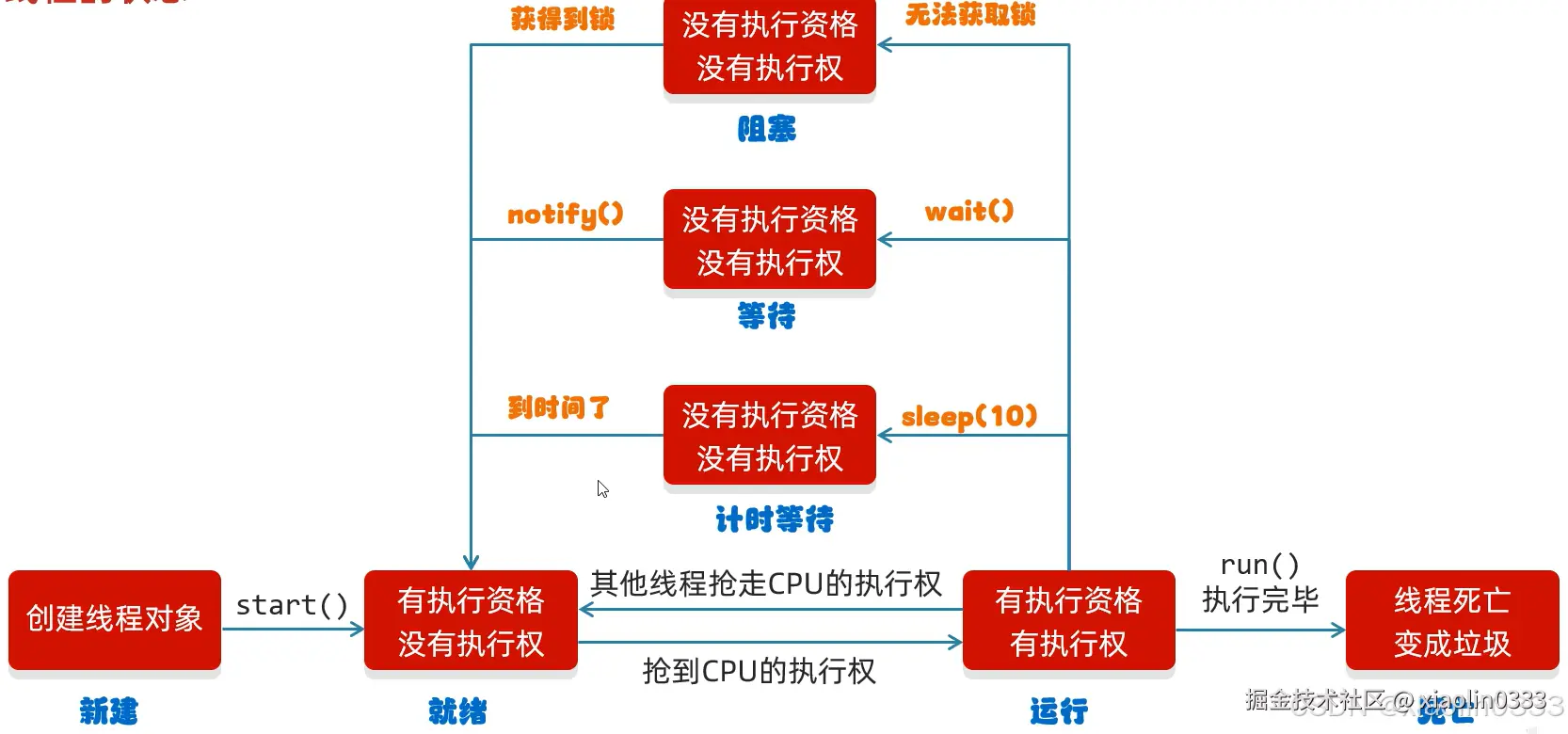 注:在Java虚拟机种只有六种状态,没有运行状态,因为线程抢到CPU的执行权进入运行状态,虚拟机就会把当前线程交给操作系统管理