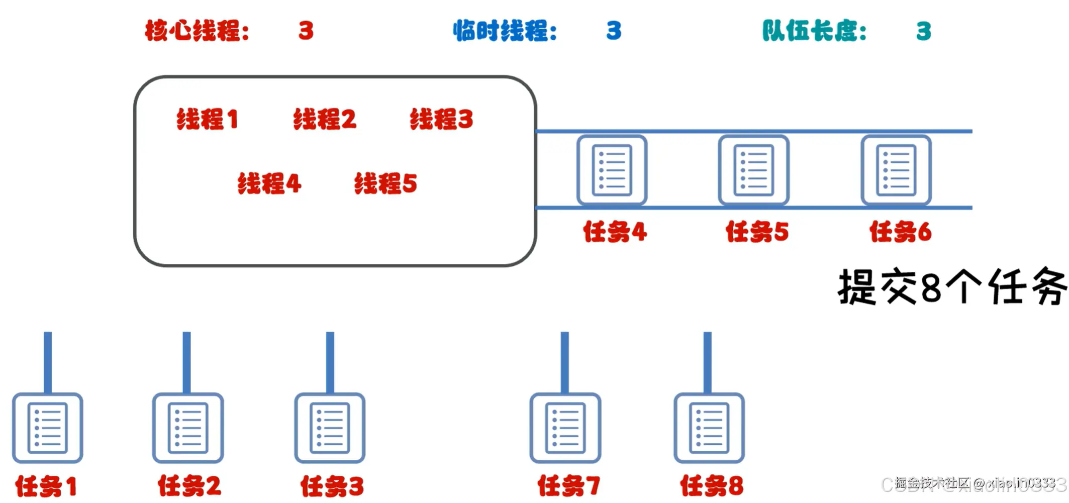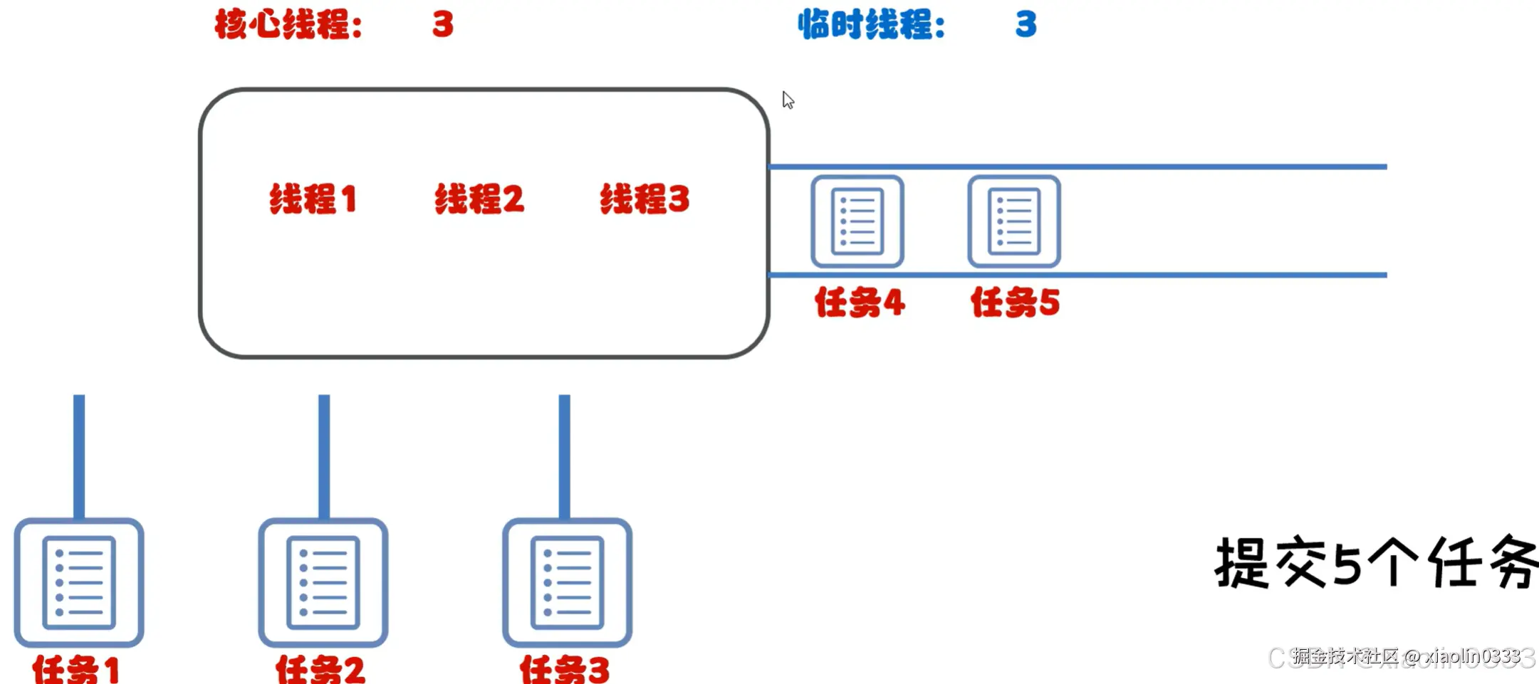 - 如果提交任务时,池子里没有空闲的线程,也无法创建新的线程,任务就会排队等待。