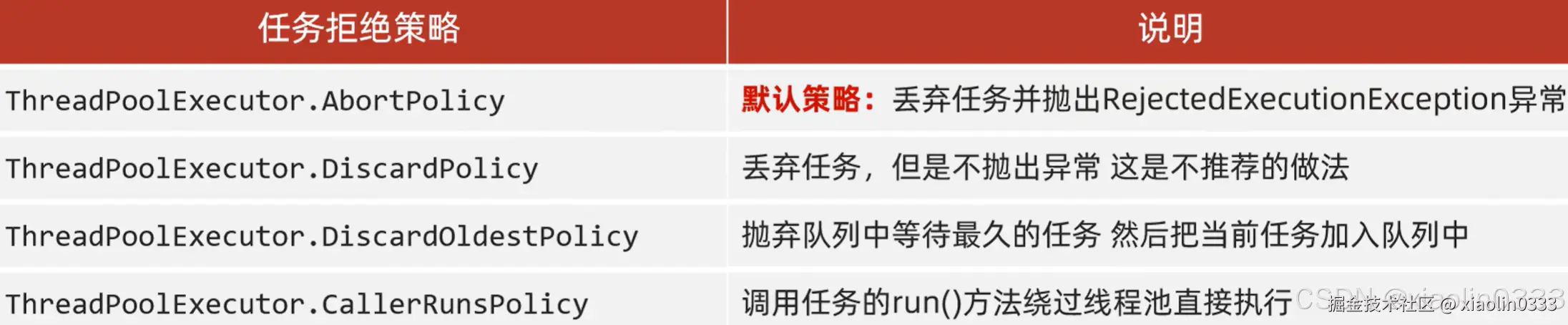 new ThreadPoolExecutor.AbortPolicy() // 任务的拒绝策略
