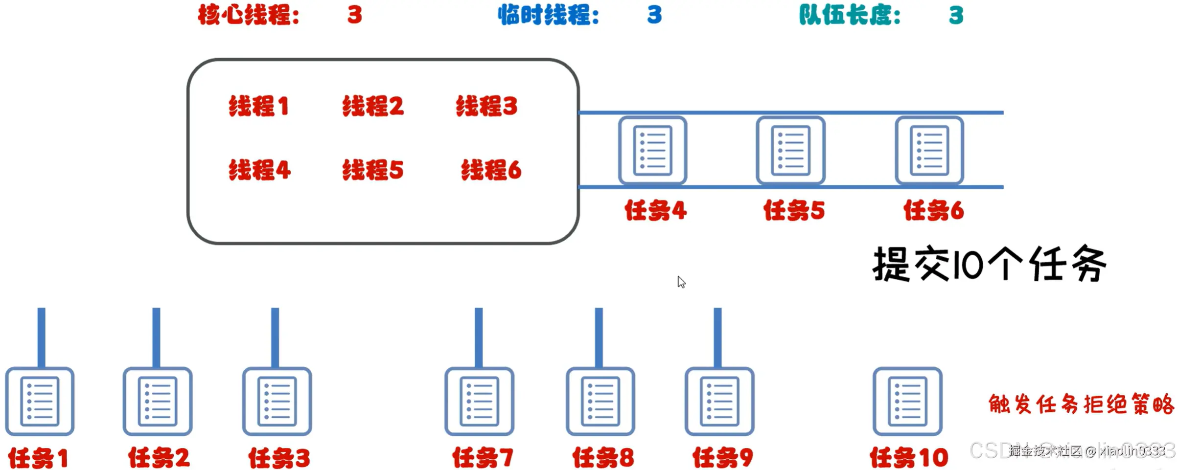 核心线程和临时线程都在工作,队伍中也排满了,此时线程池就会触发任务拒绝策略。