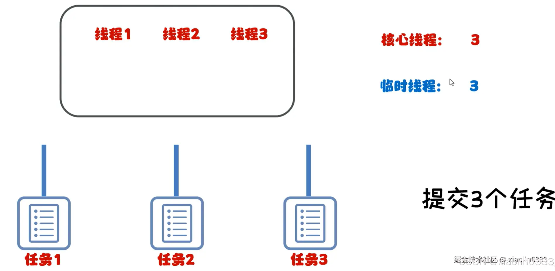 上边的代码相当于是3个线程在执行5个任务。因为创建了多个线程,所以当代码一步一步往下走的时候,上一步可能是还没执行完的。所以运行到第四个提交任务的时候,就会有一个任务在排队了,到第五个提交任务,就有两个任务在排队。