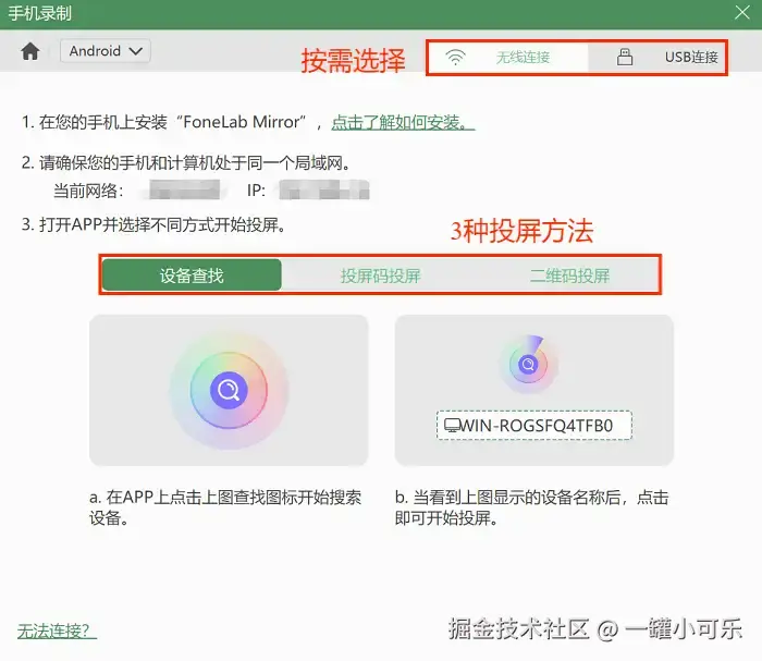 步骤2:根据屏幕上的步骤提示将手机和电脑进行连接。本文选择无线连接。在录制前,你可以根据需求调整输出分辨率、帧率等参数,设置完毕后点击红色的 “录制” 按钮,就可以开始录制手机屏幕了。