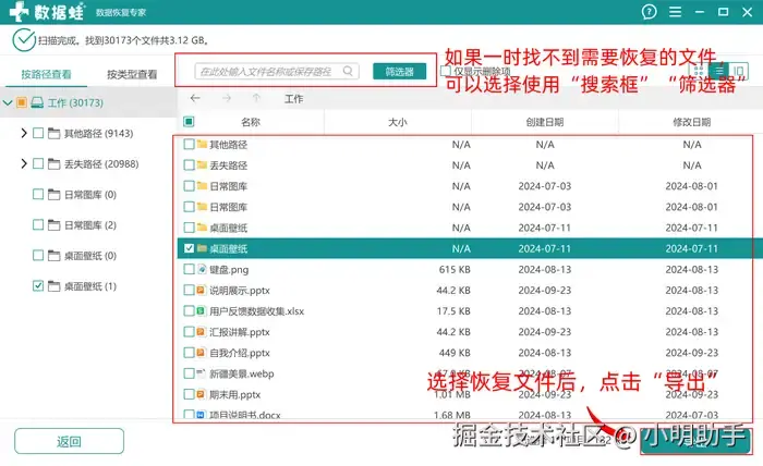 步骤2:等软件的左上角显示扫描完成后,我们这时候就能细细选择自己需要恢复的文件啦;如果不进行选择,软件则默认用户需要将全部扫描文件都导出;