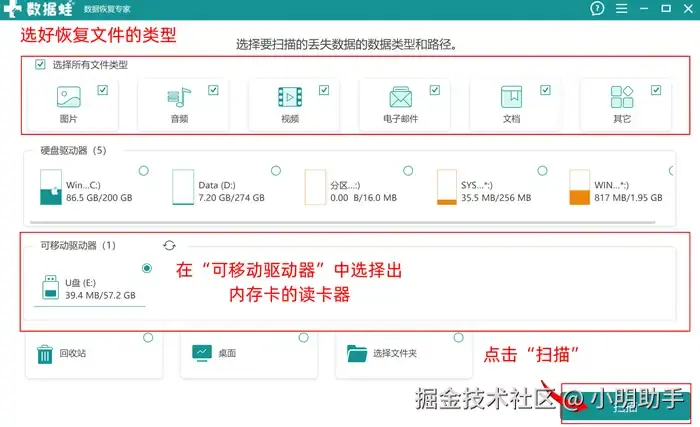 步骤1:在软件中选择自己需要恢复的文件类型,并且记得提前让内存卡连接在电脑上,在首页选择内存卡作为扫描对象,点击“扫描”;