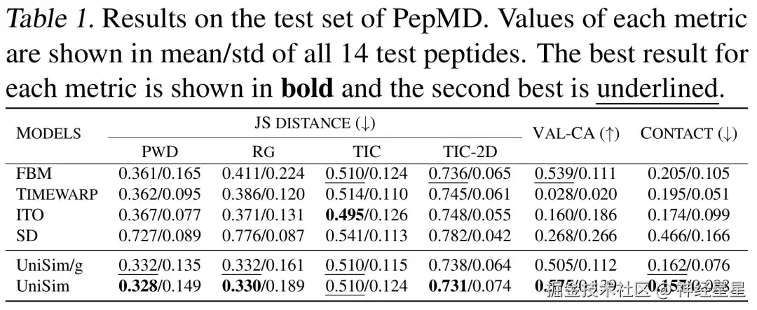 结果显示,UniSim 在所有分子类型上均实现全面超越, 在分布相似度上表现优异,并且在关键的构象合理性指标上(Val-CA)上有明显提升。需要说明的是,在前向模拟这一生成任务上,轨迹中各构象均为自回归生成,存在巨大的累积误差,因此提升构象合理性相当困难。