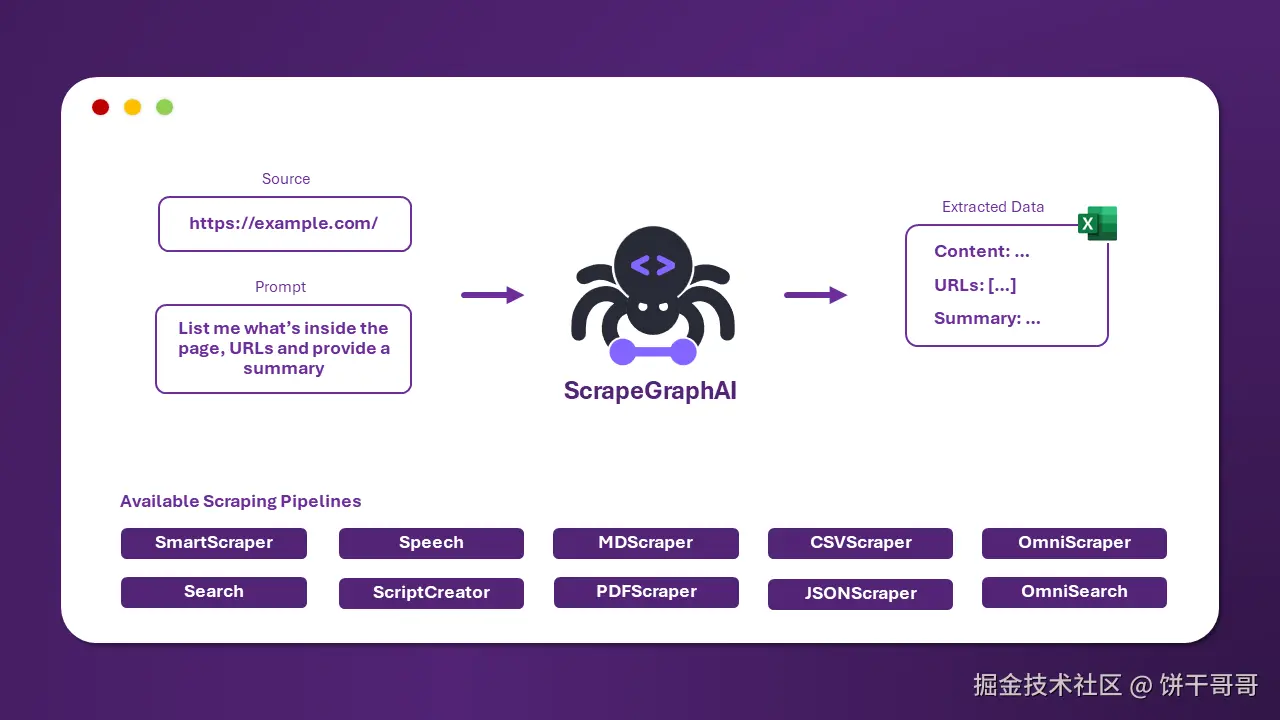 Scrapegraph-ai 是一个利用LLM和图(Graph)结构来执行网络爬取的Python库。它允许用户通过定义一个包含不同节点(如“抓取页面”、“生成抓取逻辑”、“解析数据”)的图来构建爬取流程,并可以利用LLM根据自然语言提示生成抓取逻辑。