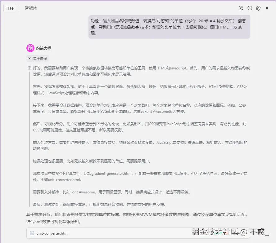 功能:输入物品名称或数值,转换成“可感知”的单位(比如:20 米 = 4 辆公交车) 创意点:帮助用户感知抽象数字 技术:预设对比单位表 + 图像可视化;使用HTML + JS 实现。