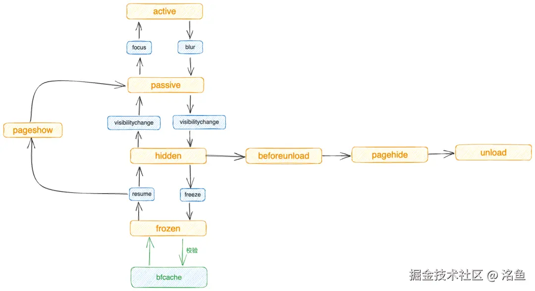 在触发 freeze 事件后,页面将被冻结,直到从 bfcache 中恢复页面,将不会触发任何事件。如果在此期间与页面的文档关联的任务或 Promise 准备就绪,则它们将在页面从缓存中恢复后执行。